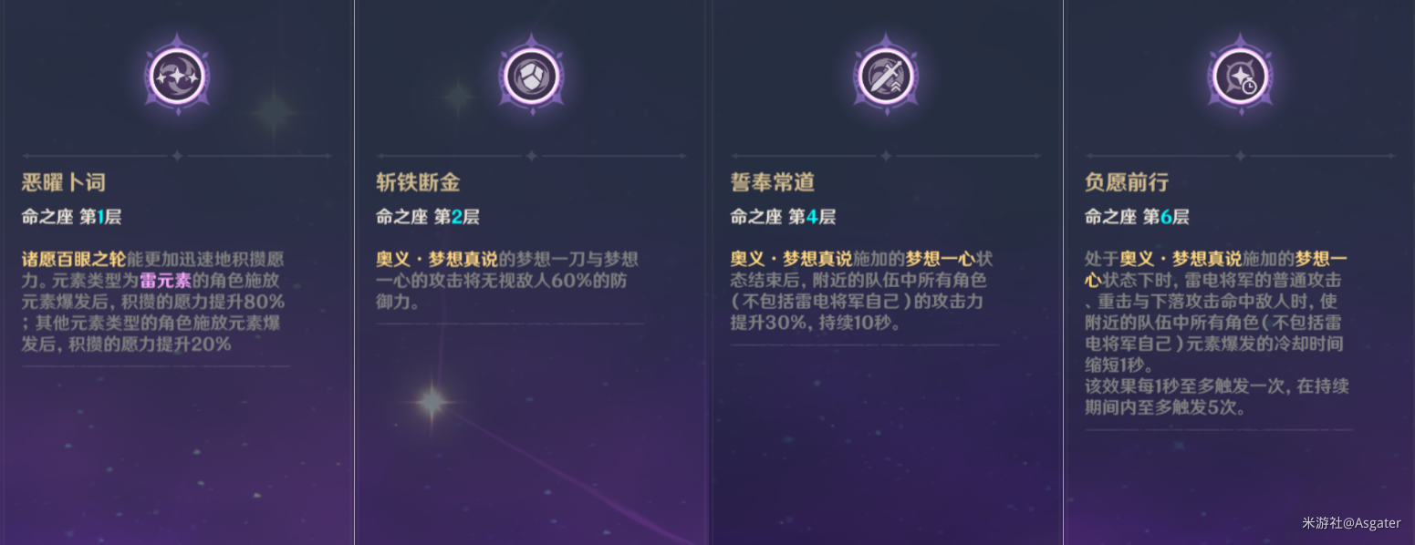 1命可以让雷电将军在其他角色释放完一轮元素爆发之后可以吃满愿力层数达到60层,而在0命下,即使是其他角色全部80能量启动也依旧无法在第一轮就获得最大的愿力层数;