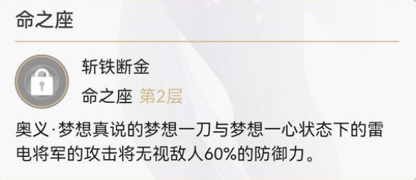 这儿先给出建议啊:推荐优先2命。2命的效果是开启大招后,梦想一刀和梦想一心可以无视敌人60%的防御力。根据敌人的防御力不同,敌人防御力=敌人等级*5+500。因此这个效果可以理解为一个动态的加伤,非固定的攻击数值加成,属于百分比。