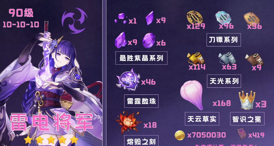 接下来附上培养雷神的攻略,此图为培养材料一览。建议保存。共需要刀镡系列材料;雷霆数珠:雷音权现boss掉落,需要过世界任务「清籁逐雷记·其四」后boss才会出现;熔毁之刻:周常boss女士,需要过主线魔神任务;升级天赋需要天光系列材料:秘境-堇色之庭(周三/周六/周日)。