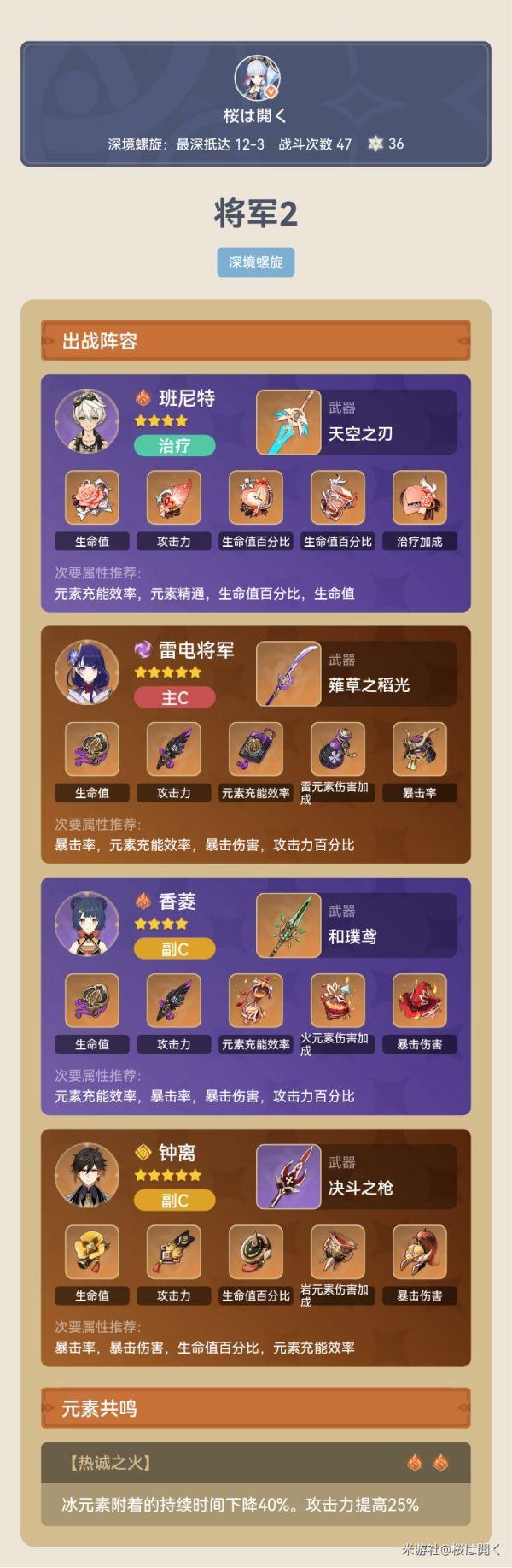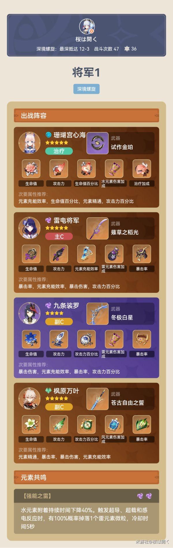 队伍1中,由于雷电将军并不缺少伤害加成(46.6+27+75(q后316充能)+86.4=235%),所以枫原万叶以提供输出为主要目的。