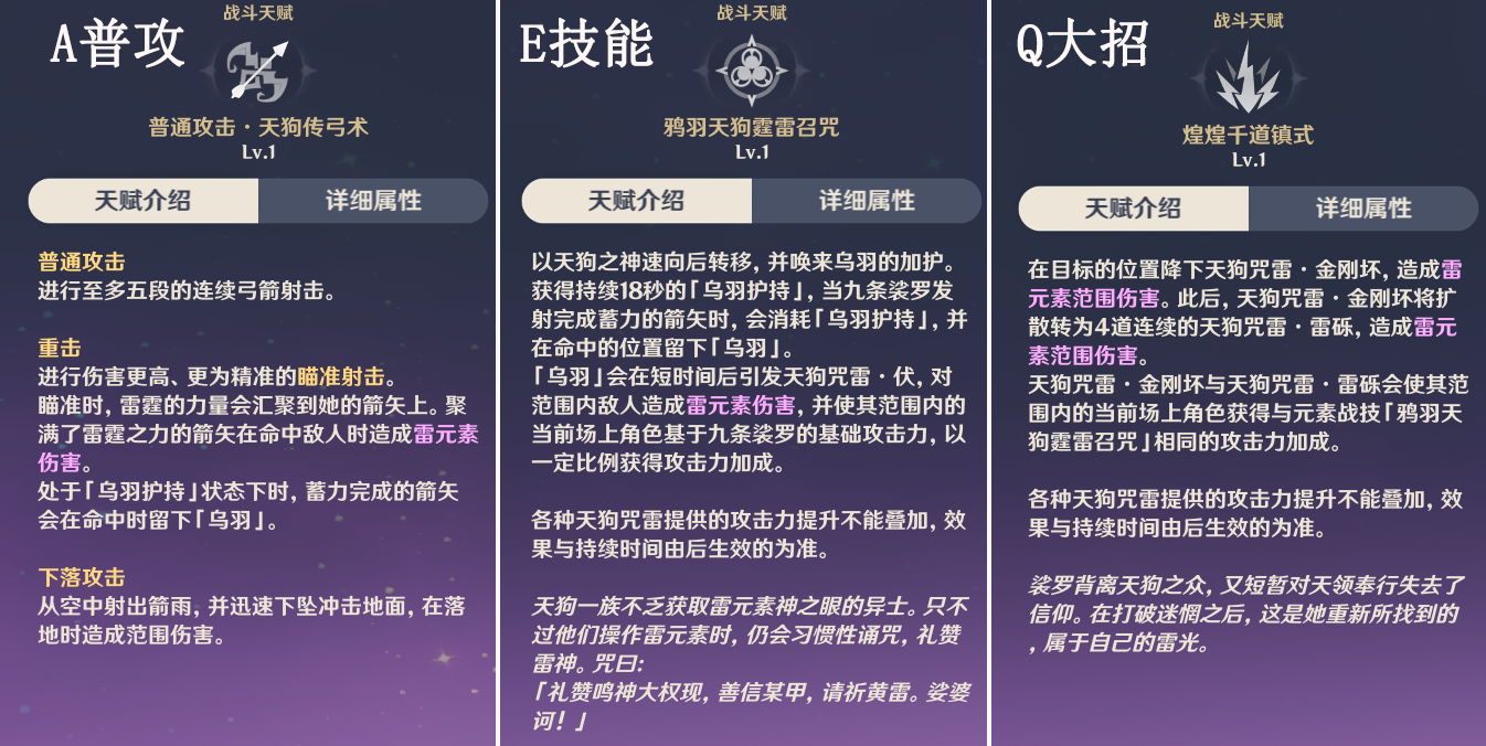 启动技能向后位移,并获得18秒的乌羽护持(九条右手上面缠绕的紫色Buff),期间蓄力射击将在命中的位置留下「乌羽」,「乌羽」会在短时间后引发天狗咒雷伏爆炸,造成雷元素范围伤害,并给当前场上角色获得百分比攻击力加成(加成基于九条裟罗的基础攻击力),要在天狗咒雷伏爆炸前切换好上场角色,并且站在爆炸范围内才有加成,也只有当前一个角色拥有攻击力加成,技能冷却时间10秒,加成持续时间为6秒,有4秒真空期,