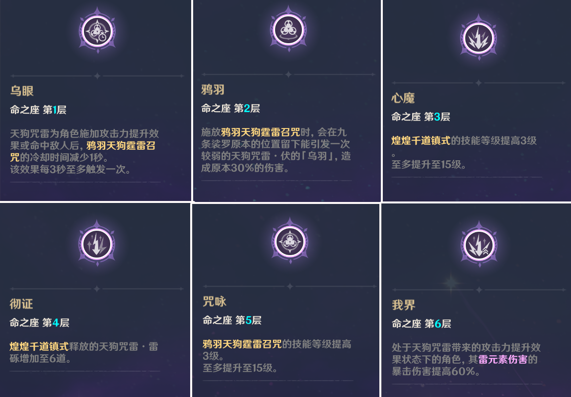 6命,在加成攻击力的状态下,再提供雷元素角色的60%暴击伤害,这命座是为雷元素主C定制的,特别是雷神这样的速切爆发,雷神大招持续时间刚好也是6秒,攻击加成也是6秒。