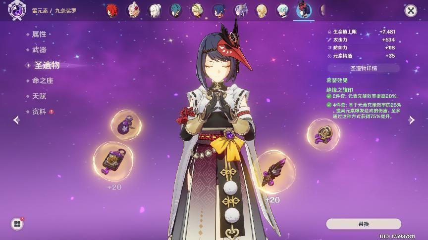 九条的圣遗物和雷神一样,都是4绝缘,词缀充雷暴。选择充能沙主要是因为自身充能差,雷神一轮大招并不能弥补九条自己的循环,她需要额外充能来保证自身循环不断。词缀以双暴、大攻击和充能为主(充能200左右就可,双雷有额外产球,可以缓解九条充能问题)。