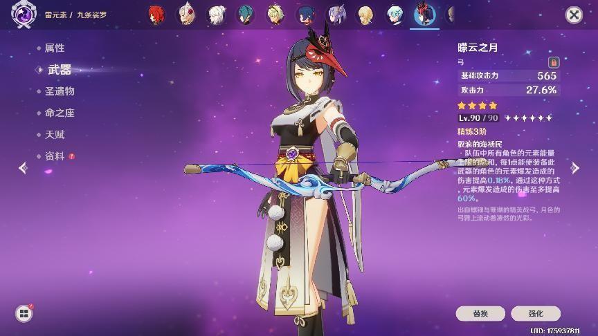武器方面,因为圣遗物选择选择了充能沙,武器就可以选择输出型武器。五星弓中可以使用天空弓,优秀的双暴可以极大缓解圣遗物的压力,高额白值也是其优势,唯一劣势就是没有被动属性。