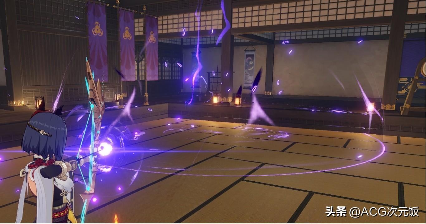 九条的用法对于初见玩家可能较为陌生,但只要弄清其原理便能轻松使用。以零命九条为例,在释放战技后,只要在18秒之内向自身周围地面蓄力射出一箭,便会留下加攻的“乌羽”标记,此时迅速切换角色,乌羽会对场上角色提供攻击加成。换言之,留下“乌羽”很类似班尼特的“点赞”。另外,九条释放大招后也有相同的加攻特效。