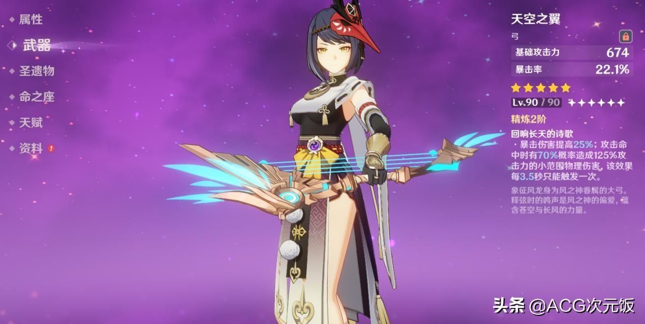 武器选择上,五星弓普遍有六百以上的“白字”攻击力,而天空之翼攻击力最高,对加攻能力提升最大。当然,五星武器多少有些“奢侈”,在四星武器中,祭礼弓是最适合九条的武器,一方面祭礼弓的基础攻击力较高,另一方面它可以概率刷新九条的战技,可谓一举两得。
