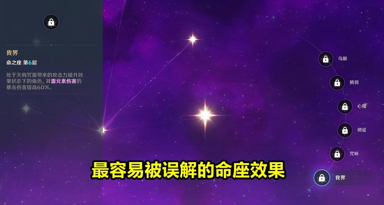 前面几层命之座都比较容易理解,真正让很多玩家犯错的是这个6命的加暴击伤害的效果!很多玩家下意识地将目光盯在了“60%暴击伤害”这个几个字上面,却下意识地忽略了文案中两个限定条件:“处于九条攻击力加成状态下的角色”,“雷元素伤害的暴击伤害提升”。
