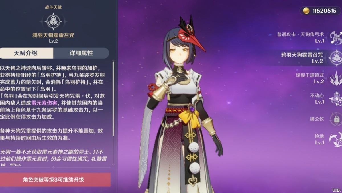 九条娑罗大招拥有超夸张的倍率伤害(只有九条为中心的落雷)和其他补助小落雷,造成范围伤害,同时会获得和元素战技的蓄力攻击同样的攻击力加成。同样是6秒,同样的和元素战技同样的攻击力加成倍率,0命和1命的元素战技手感问题的最佳解决方案,只靠元素爆发加攻(虽然冷却时间和需要的元素能量超级多)这里根据天赋的描述来说,天狗咒雷有3种,元素爆发这3种的都会加攻击力加成,而且加成的量都一样,不会叠加,所以还是可以使用班尼特让攻击力再次提升成另一个档次。
