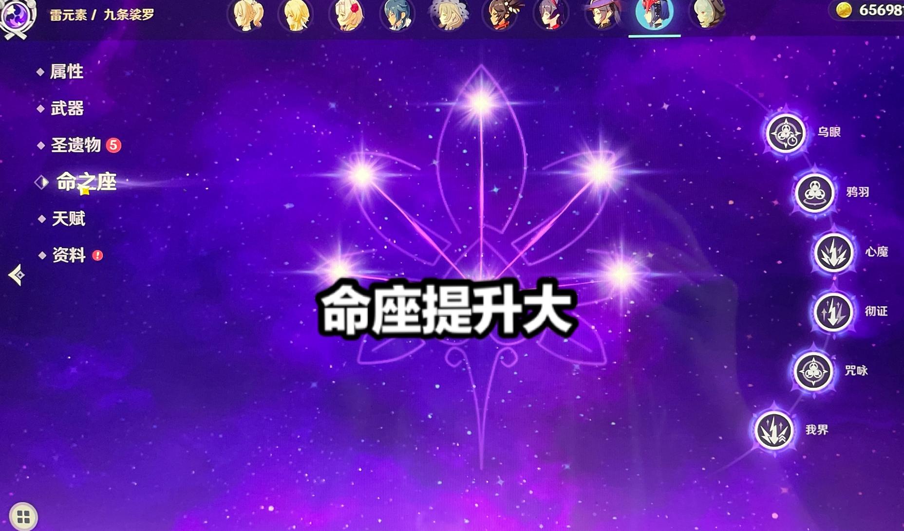 看到这里大家是不是觉得九条是一个类似班尼特一样的角色呢?其实不然,九条的辅助能力远远没有这么简单,因为九条是雷神的专属T0级别辅助,有以下三点原因,第一,九条是雷系角色,雷神也是雷系角色,双雷元素共鸣,可以让雷神的充能更快,也可以让九条频繁的释放大招。第二,九条的命之座对于辅助能力的提升非常大,当九条满命之后,可以给雷系角色提供60%的爆伤,这是什么概念呢?就相当于一件强化20的爆伤圣遗物了,而雷神因为强堆元素充能和攻击,本来就缺少暴击伤害,因此这个加成很大程度上能够弥补雷神爆伤的不足。