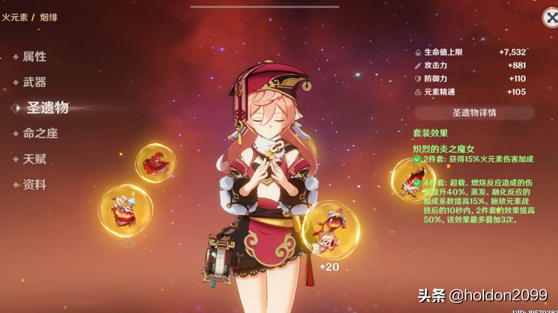 首推当然是炎之魔女四件套,其次是流浪四件套。主词条需要注意攻击沙漏、火伤杯和双爆头,副词条需要百分比攻击和双爆属性。如果让烟绯做副C,那需要给她补充元素精通。如果萌新还没有这些,那就根据属性选择其他圣遗物吧。