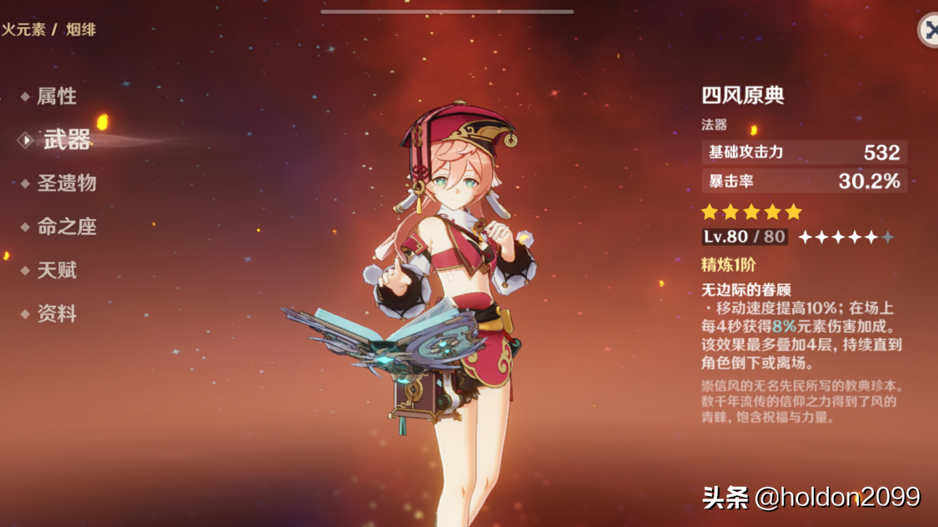 至于她的武器,五星武器推荐四风原典和天空之卷,前者加暴击但需要过久的站场时间,后者增加攻击力并提高元素伤害,在15秒内主动攻击附近的敌人,造成等同于160%攻击力的伤害。对于4星武器,推荐流浪乐章和嘟嘟可故事集,前者增加暴击伤害以及攻击力或元素伤害。后者提升攻击力并增加重击的伤害。其实大多数增加攻击力、双爆的4星武器都适合烟绯。如果实在没有合适的四星武器,那三星武器:翠玉法球也是个很不错的选择。
