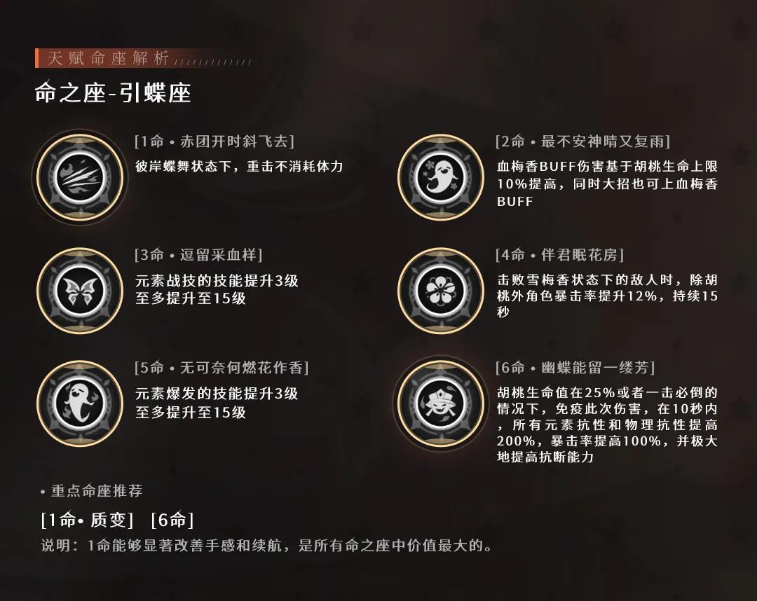 目前1命较为重要,开e重击 不消耗体力,不但极大的提高了输出效率,还提高了胡桃的生存能力,避免胡桃因为重击过多消耗体力。是胡桃玩法的一个大改变,可以自上而下的改变一个阵容和搭配的命座。