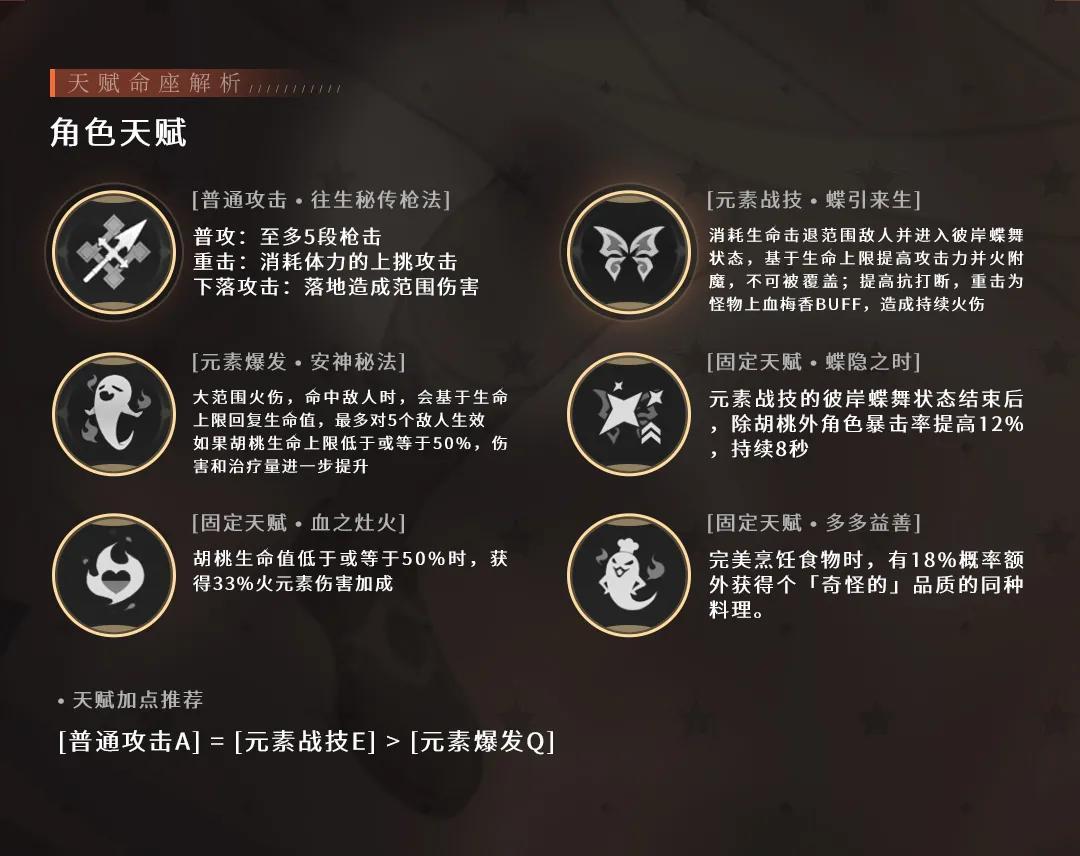 胡桃E是核心技能,为胡桃附加最高基础攻击力400%攻击力加成,同时还提供了火附魔,让胡桃可以进行反应输出。