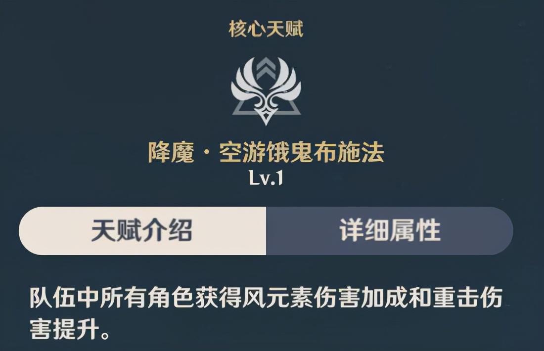 核心天赋—降魔.空游饿鬼布施法:简单易懂,直接提升伤害的被动技能,作为核心技能,可以在场下作为挂件,为队伍中的风元素角色提高伤害,并且也提升了重击伤害加成。所以魈也可以作为辅助角色出场,但不推荐作为辅助。作为挂件,魈的加成挺不如别的辅助角色提升得更多,更推荐把魈作为主C或副C使用。