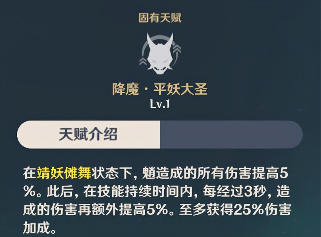 固有天赋—降魔·平妖大圣:因为这项天赋的存在——持续站场才有加成的限制条件,能更容易地触发重击,不再需要利用地形来进行,让整个角色的机动性有了质的飞跃。能更容易地触发重击,不再需要利用地形来进行,让整个角色的机动性有了质的飞跃。