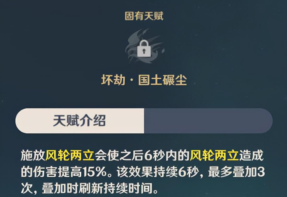 固有天赋—坏劫.国土碾尘:三破解锁,在使用过一次风轮两立之后6秒内,再次使用风轮两立,伤害提高15%,持续时间6秒,最多叠加3次,叠加时刷新持续时间。