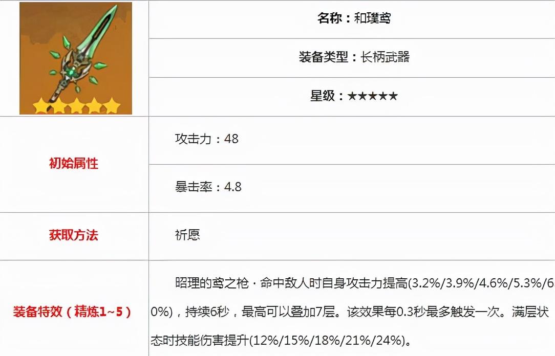 五星武器和璞鸢(祈愿获得):命中敌人时自身攻击力提高,持续6秒,最高可以叠加7层。该效果每0.3秒最多触发一次。满层状态时技能伤害提升。