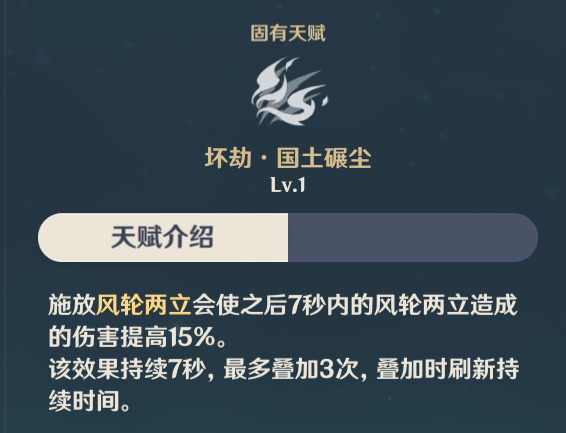 开启元素爆发后,如若下落攻击命中2名以上目标时,元素战技回复一次使用次数,并在接下来1s内可以无视冷却时间施放风轮两立(实战为额外2次)