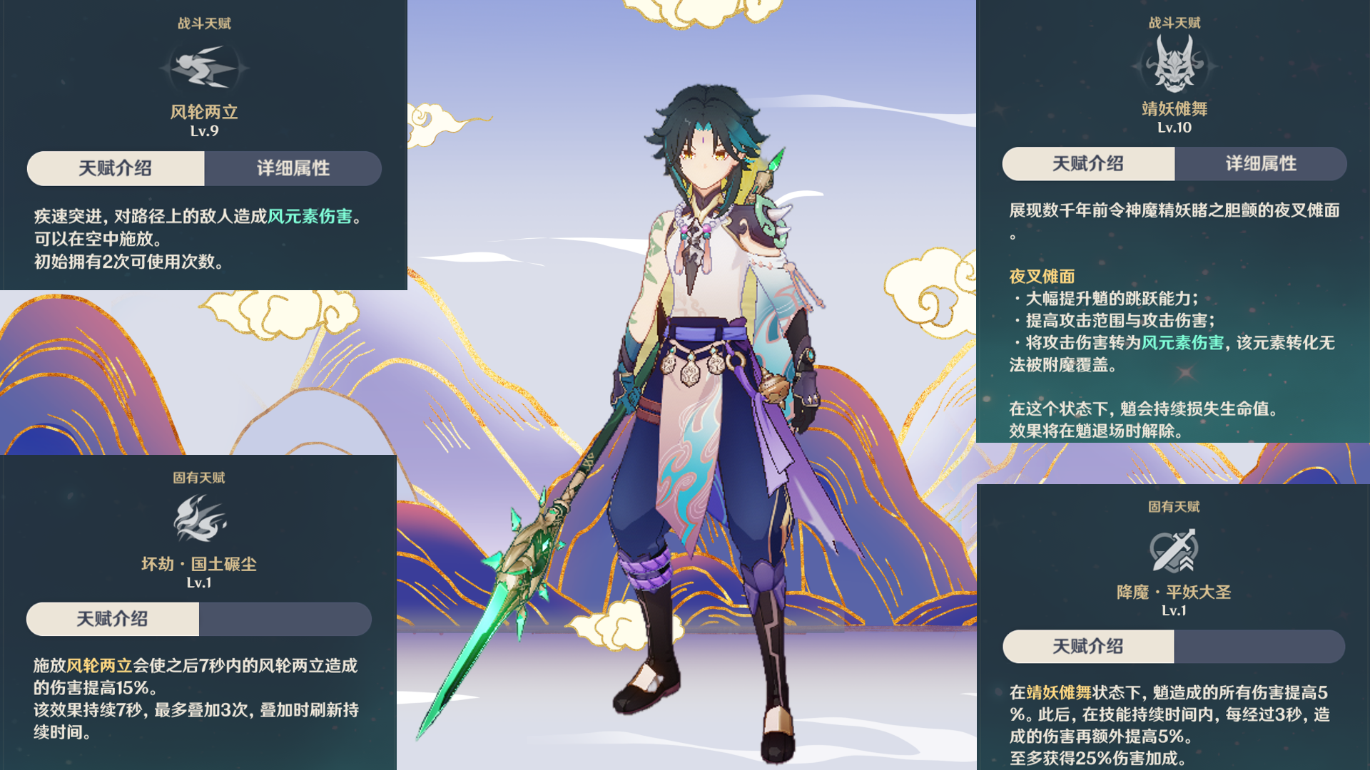 从魈的机制来看,【靖妖傩舞】能够使魈普攻转化为风元素伤害(无法被其他附魔覆盖),范围伤害和攻击力会提高,提升跳跃能力,所有输出基本靠大招状态下的下落攻击。与此同时,固有天赋【降魔·平妖大圣】还能提升魈大招【靖妖傩舞】状态下所有伤害5%~25%。