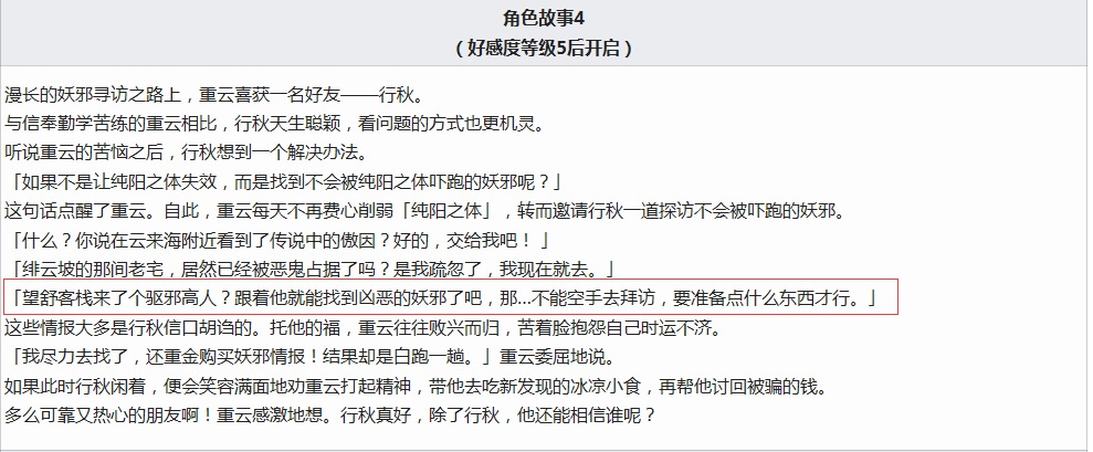 事实证明,米哈游已经铺好了路。上图所示,在重云角色故事4里面写道:重云准备拜访望舒客栈里的驱邪高人。这个驱邪高人是谁呢?机智的玩家应该想到了,没错,就是魈。