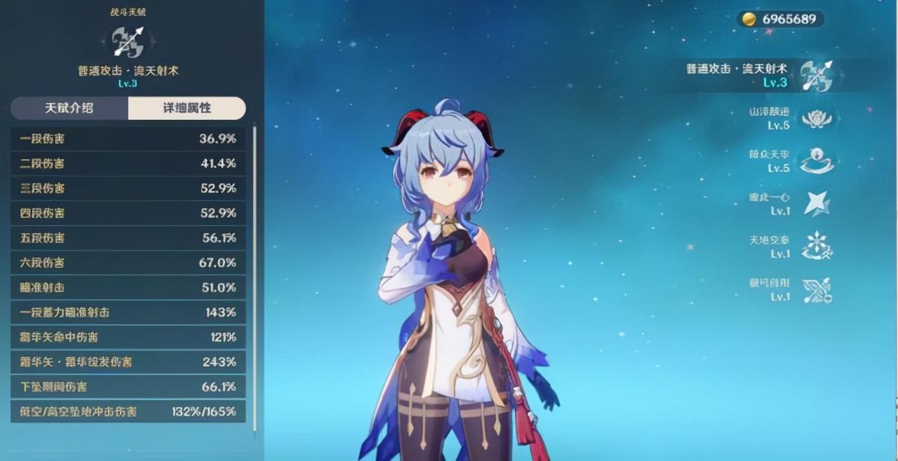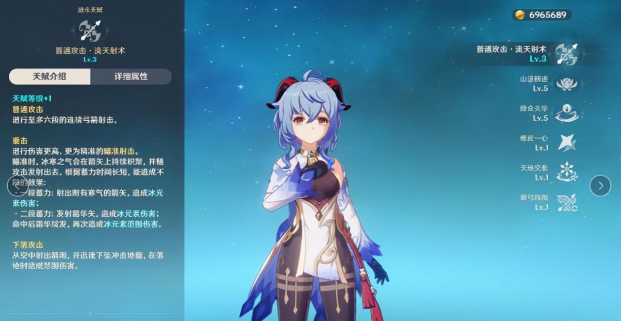 普攻·凌天射术:甘雨进行至多6段的连续弓箭射击,不考虑第六段60%的攻击情况,甘雨的普通同比其他弓箭手(安柏、公子、菲谢尔)都低,不建议作为常规输出手段使用;