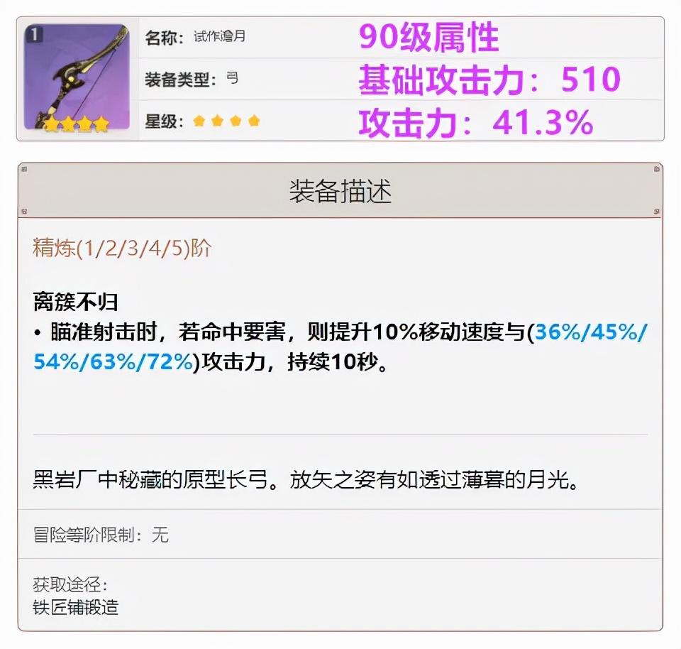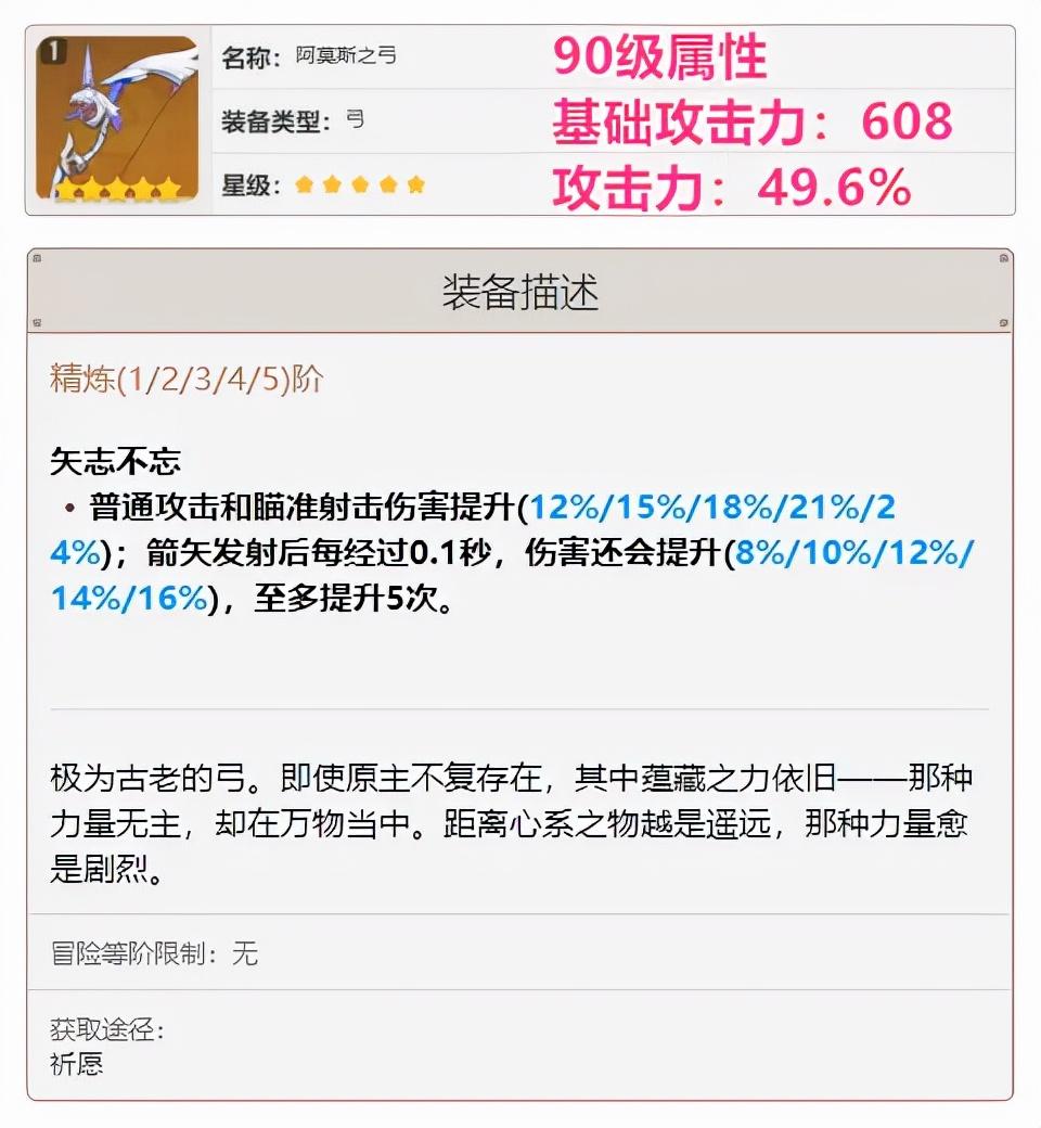 人称小阿莫斯,作为锻造武器比较容易获取且高精,性价比高。弱点攻击有较高攻击增幅,但是要瞄准弱点攻击,增加了操作难度,是蓄力首选。武器特效触发的情况能够提供高额的攻击力加成,虽然会被稀释不少,但它给的实在是太多了,所以是比较适合甘雨的武器之一。