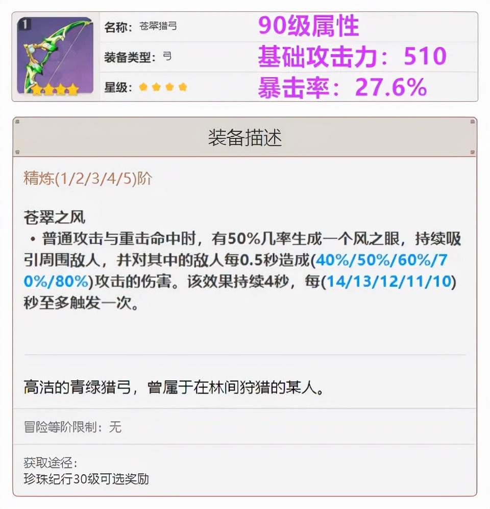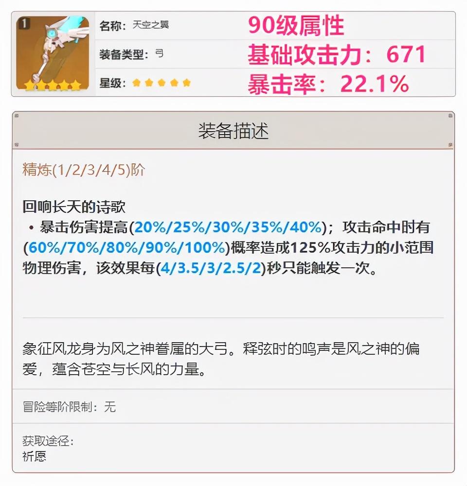 最吃香的弓,副属性跟武器特效提供宝贵的双爆,极大地降低了圣遗物毕业难度,硬要说缺点就是僧多粥少,作为泛用性最高的五星弓,需要用到它的角色太多了,当然也适合甘雨。
