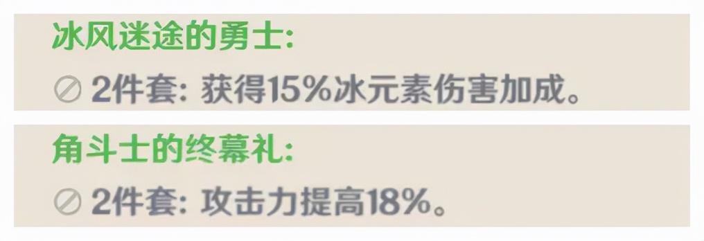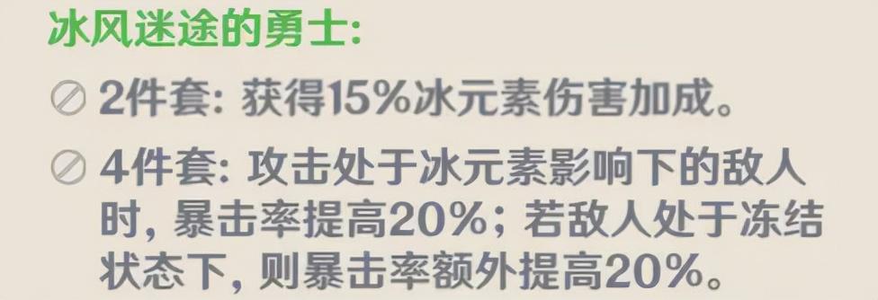 冰风4件套:优点是多了很多暴击率,可以追求更高的暴击伤害,对暴击不够的小伙伴非常友好,同时让霜华绽放更佳稳定,有水元素配合更是能全屏暴击数字。