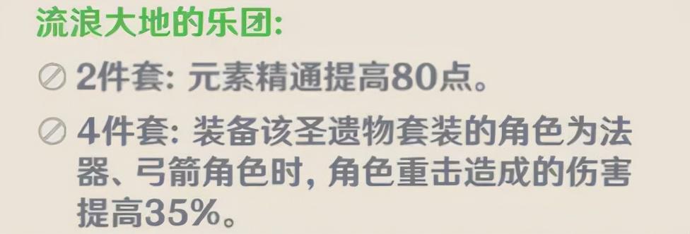 流浪乐团4件套:因为甘雨输出手段主要是蓄力重击的范围AOE伤害,是吃重击伤害加成的,所以是完美契合甘雨的蓄力输出模式的,2件套的80点精通对融化反应的增幅也是很可观的,总体提升对于蓄力流还是很大的。