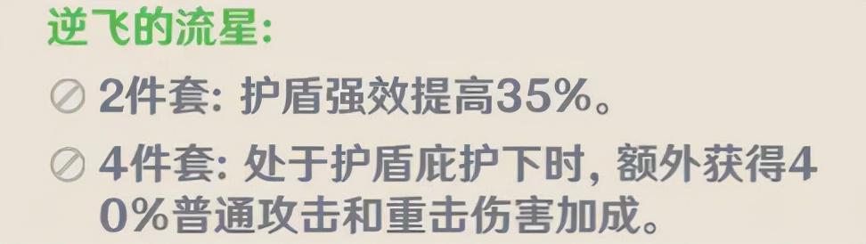 流星4件套:甘雨血量和防御成长不高,非常脆,又因为要持续站场输出,所以可以考虑这种增加生存能力的套装,就是逆飞流星4件套。两件可提高35%的护盾效果,可以搭配钟离等套盾角色使用,有效提高甘雨的生存和抗打断能力,4件可以提升40%的重击伤害,也很契合甘雨的蓄力重击的输出模式。流星4件套既保证了生存,又提高了输出。