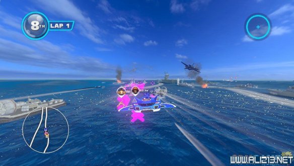 水域竞速:1、加速踏板;2、很多时候水域上的波浪可将船打高,所以尽量乘波浪而上,高空中翻滚可以获得加速氮气;3、弯度漂移加速
