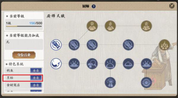1、首先打开游戏,点击菜单-身份-厨师,之后点击烹饪一栏的查看,进入烹饪界面;