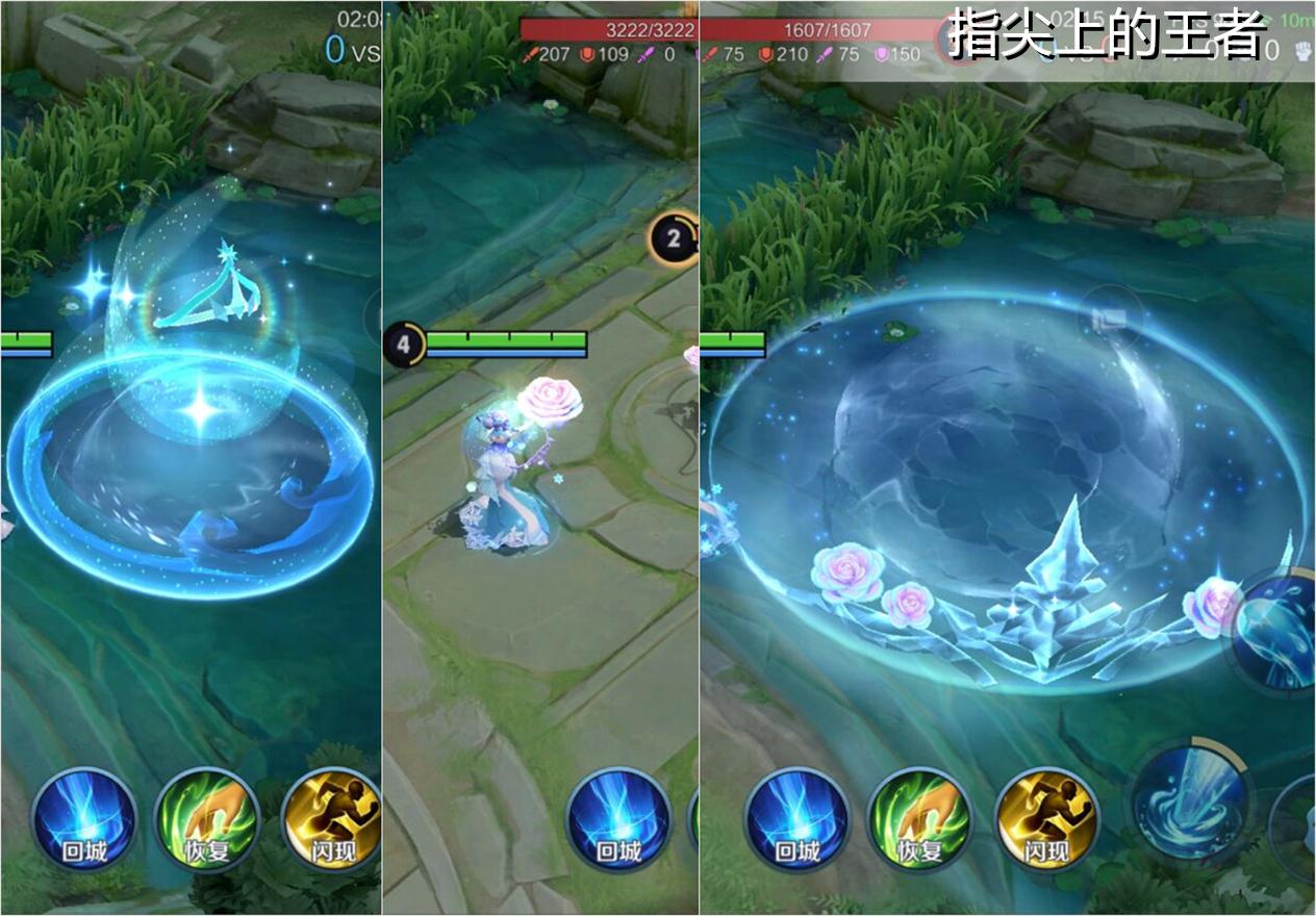 局内的建模非常漂亮,虽然没有改变百褶裙的锚点,但走路时拖尾的水纹波动的确好看,1技能弹出来王冠,大招依然是王冠,镶嵌着冰封的玫瑰花,看起来尊贵典雅,算不上特别华丽,但会让人很舒服。