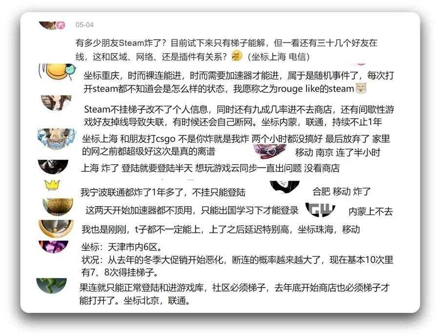 于是发了个动态问了下大家,发现和地区、运营商、加速器等,并无必然关系(但网上普遍反映移动的问题多一些),全国各地哪儿都可能遇到这个情况,同地区也有很多正常能连上的: