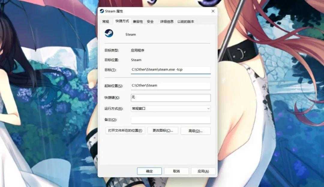 ②在[快捷方式]栏中的[目标]路径中,如图所示添加[-tcp]或[ -websocket]后缀(注意前有空格)