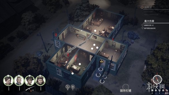 本关的难点是比尔梅耶所在的房子(下图)中间有三基佬深情对视以及一个巡逻的敌人(白点),首先清除房子周围所有敌人,避开围绕房子走动的巡逻队,让桑德埋伏在门口(2号点)。