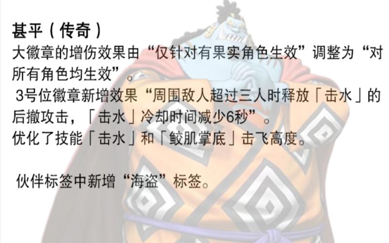 这个主要是PVE方面的,甚平的大徽章增伤效果,从之前仅针对果实能力者生效,改成了现在对所有角色均生效。之前为什么觉得刮痧?就是打非果实能力者吃不到这个增伤。