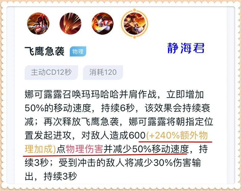 其次,娜可露露的伤害和物理攻击力有很大关系,她应该是第一个有额外物攻加成说法的英雄,很需要装备支撑的她更需要看重的应该是发育而不是gank。