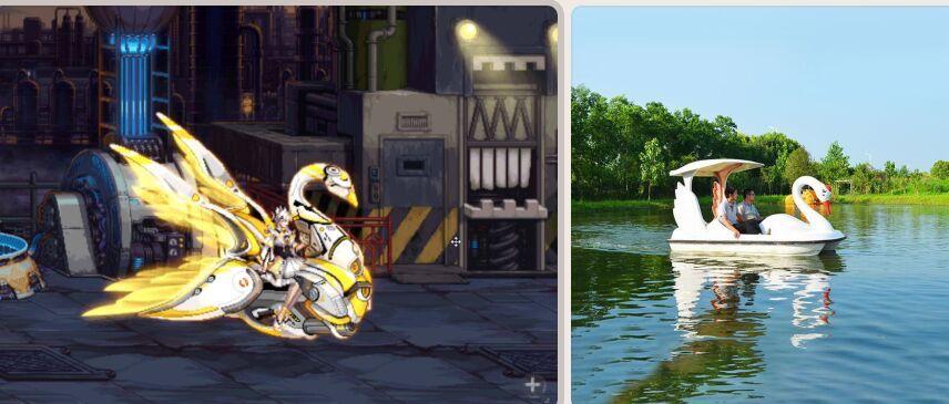 这不,我那家们看到女枪的天鹅形状的机甲坐骑,联想到了很多地方的公园或者游乐场里会有天鹅形状的小船,怎么样看起来是不是很像?
