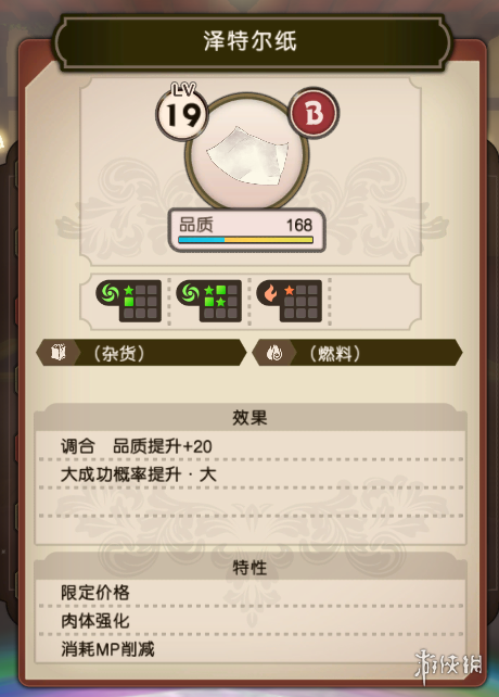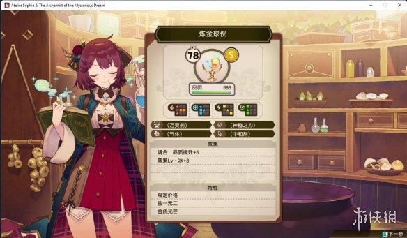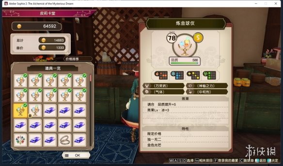 2.回到炼金工房,使用苏菲调和炼金球仪(建议将炼金球仪配方加入最爱),依次加入贤者之石,海星徽章,贤者之石,杂货,然后按f随意投料,继承特性限定价格+独一无二+金色光芒。