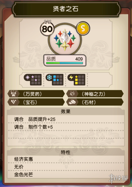 1.贤者之石, 特性:经济实惠+无价+金色光芒 效果:调和 制作个数+5。
