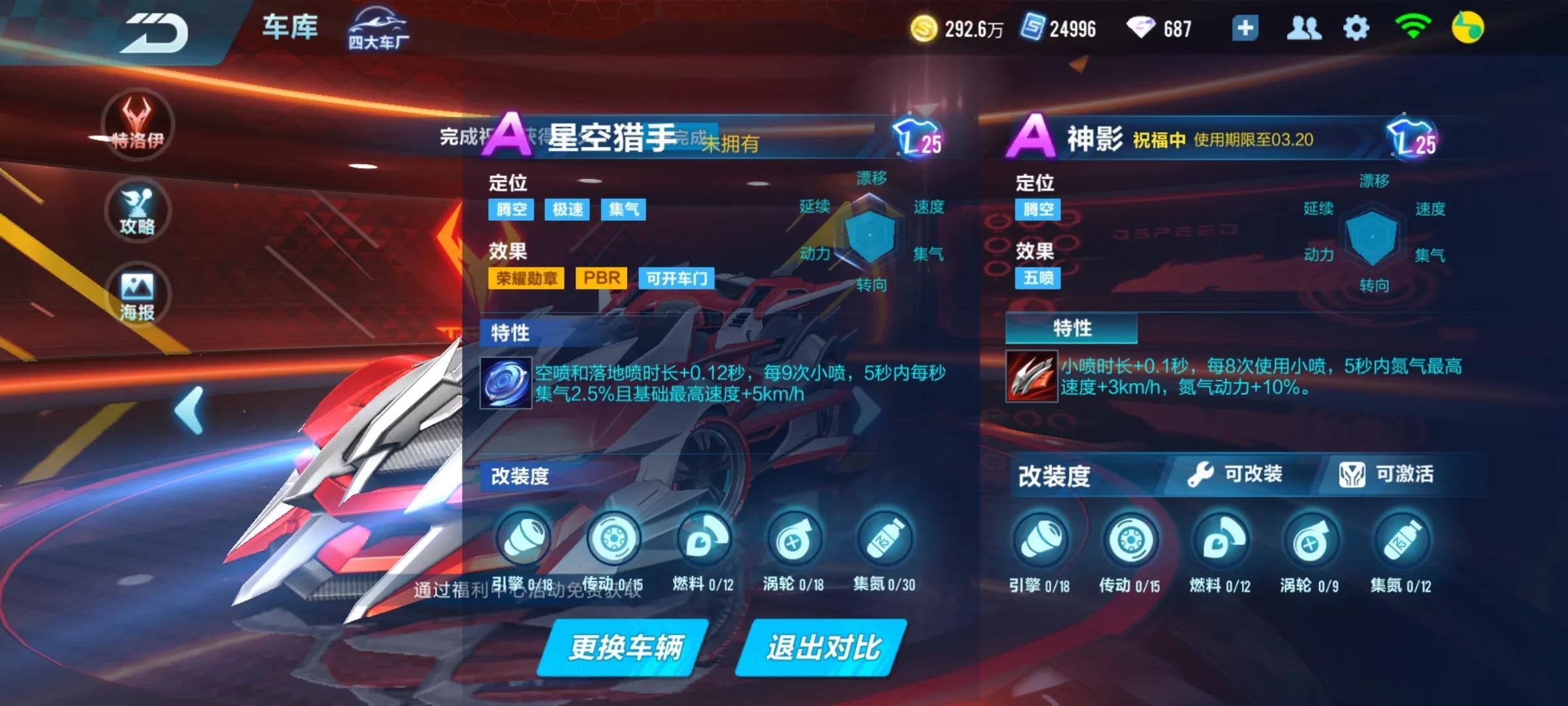 性能的话,从特性和六维图来看,除了集气差点,可以说平移星空猎手,作为一辆免费车,性能赶上了星空猎手,认真完成赛车任务的话,基本上两个月就可以得到A车神影了。