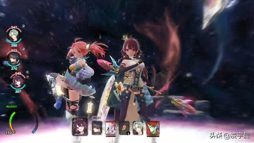 尽管gust的RPG作品都已经逐步向着半即时战斗转型,但是作为不可思议篇的续作,本作在玩法模式上还是还原了以往的作品。不过即便如此,在各类系统上的改进也是相当显著的。首先是组队方面采用了在A19中再次被启用的3+3形式,不过不同于黄昏三部曲的前后排模式,本作中的组队系统的功能性更偏向于前作A17。相比起A17中攻击站姿时触发Chain Link追加一次队友攻击,防御姿态触发Chain Link追加一次队友援护,本作中则是直接可以通过消耗TP值召唤队友进行援护防御和双重攻击等一系列的操作,在体验上更像是对不可思议三部曲的战斗系统整合并进行了精简。