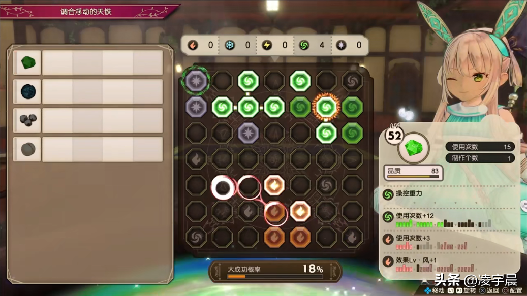 炼金方面本作再一次使用了A17的调和槽功能,根据投入素材的成分决定最终的品质,对调和槽要求的还原度越高,品质也就越高。同时也加入了A18中的连线奖励,相同色块相邻会形成连结状态,调和时连线越多追加奖励也就越多。本作在调和的规则上变动并不大,炼金釜的框架依然来自不可思议三部曲,玩过前作的玩家可以很快上手。