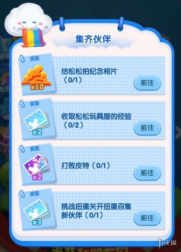 集齐伙伴任务共含四个小任务,其中第一个任务是给松松拍摄纪念照片。只需使用过关积攒的皇冠,为松松建造玩具屋。然后选择相应松松头顶的相机标识,按照要求为松松拍摄纪念照片便可完成任务~