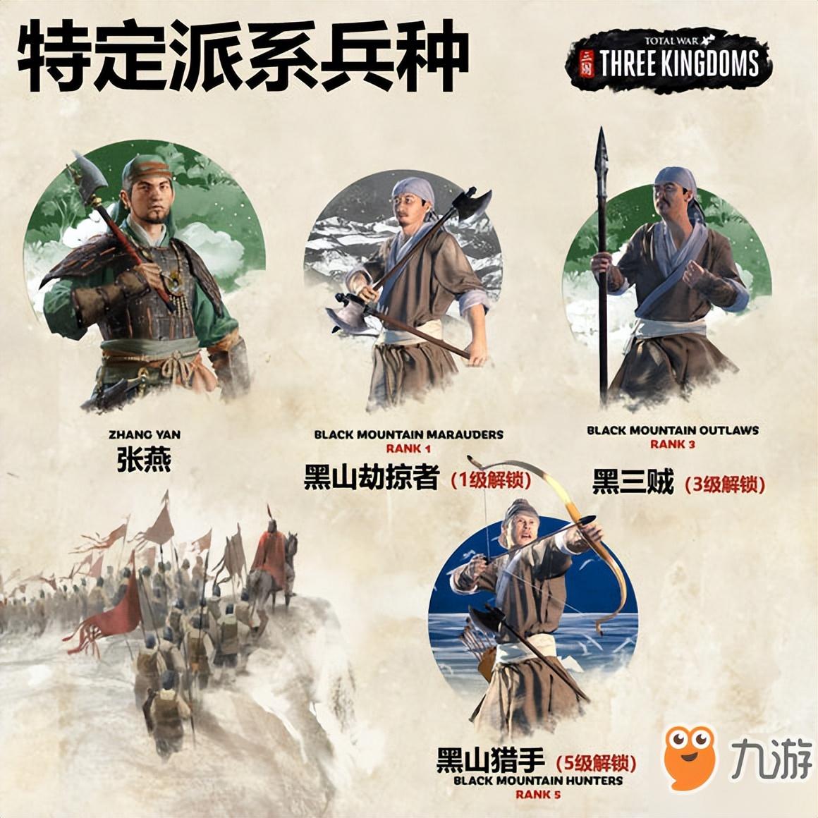 特殊兵种黑山劫匪,司职突击,可以造成惊吓与游击部署。特殊兵种黑山贼徒,司职反制骑兵,可以造成惊吓与游击部署。特殊兵种黑山猎手,司职后排,可以造成惊吓与游击部署。