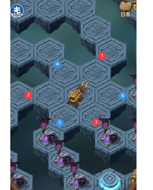 这个副本是需要杀最少两次才能够拿到所有奖励,而且每次除了最后一个怪,其他怪都不能失败的,如上图红色1 2 3,是第一次要走的路线,杀完之后会出现一个传送阵,传送到小岛上杀怪,怪物有2个一个是狮子老大,一个是苍白老大,我是杀苍白耗过去的。这个会奖励苍白,然后结束,在走4 5 6线路在杀怪,传送杀怪。
