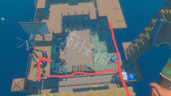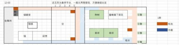 这个是一层的大致布局,可以提供个参考。分为前中后三段。前段是收集网、储藏室、厨房,是主要的工作区域;中段是个平台以及两列宽的走廊,走廊高一格,为了隐藏好两种管道,中段基本就是侧方停船上岛的通道;后段是动植物养殖区。