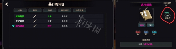 面板参悟,可以通过在天书阁回收武学提高,右侧是修为,就是已经学习的武学占用的修为总和。