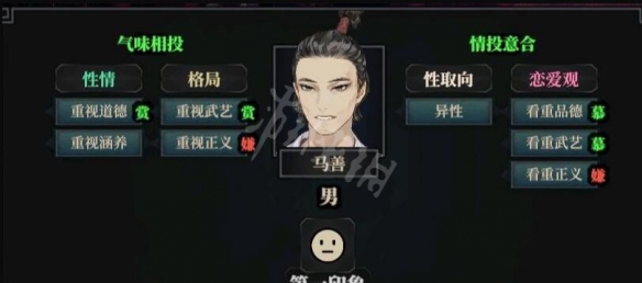 以图中NPC为例,当玩家的道德,涵养,武艺评分较高时,第一印象就会气味相投。这时候送礼物,好感度就会长得飞快。反之,则好感度涨的很慢。所以要提升NPC好感度还需先提升自身的相关属性。